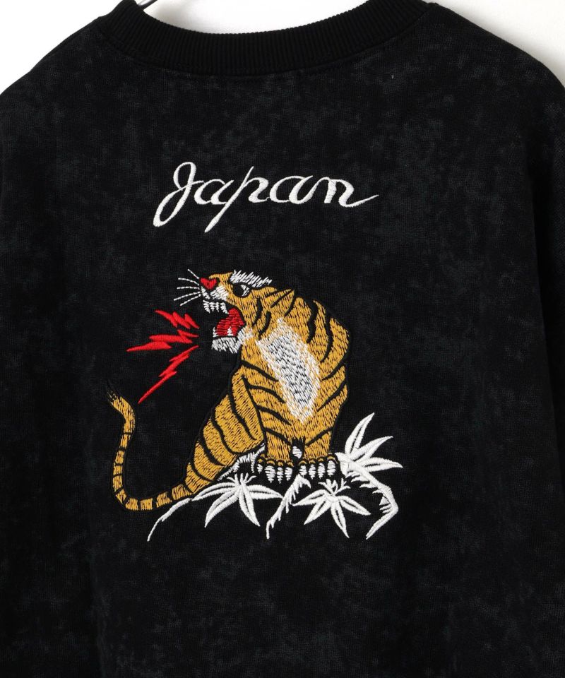 ムラ染めの裏毛素材に、スカジャン風のトラさんの刺繍がとんでもなくかっこいいトレーナーに仕上がりました。