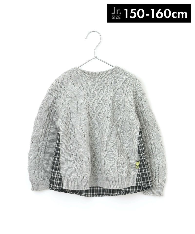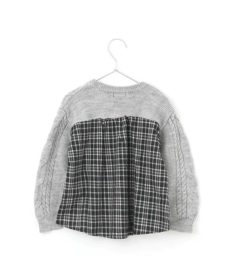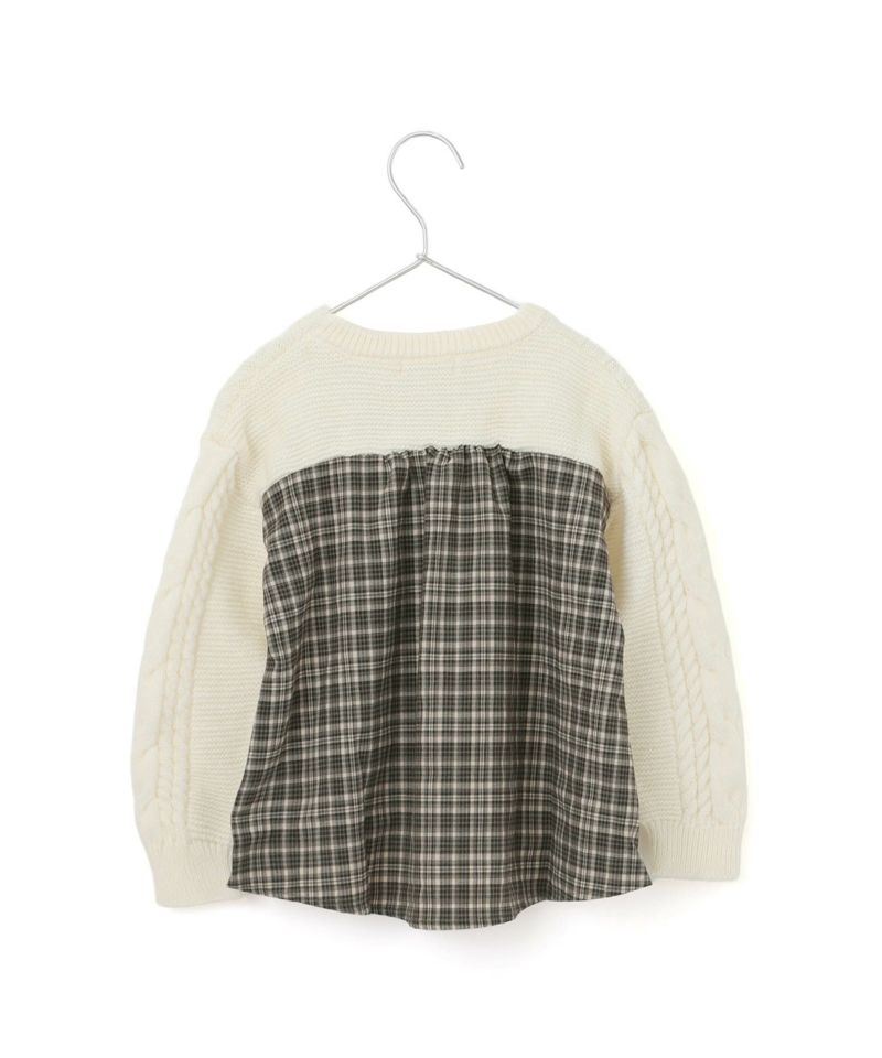 アラン模様のニットと、チェック生地が前後で切り替わっているプルオーバー。