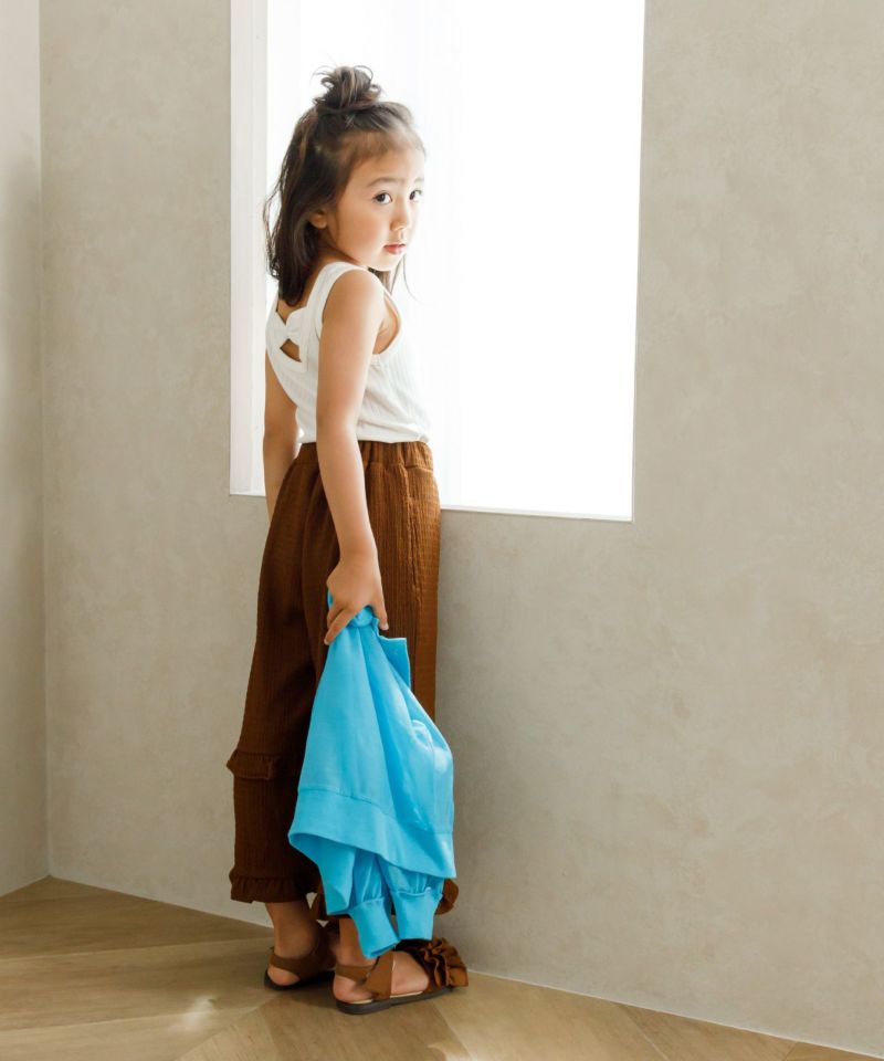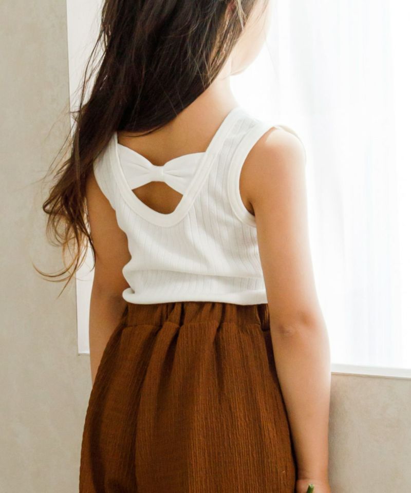 後ろに大き目のかわいいリボンがついていて、1枚でアクティブに着ていただいたり、大人みたいにシャツの中にインナーとしても着ていただけます◎