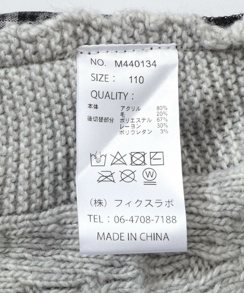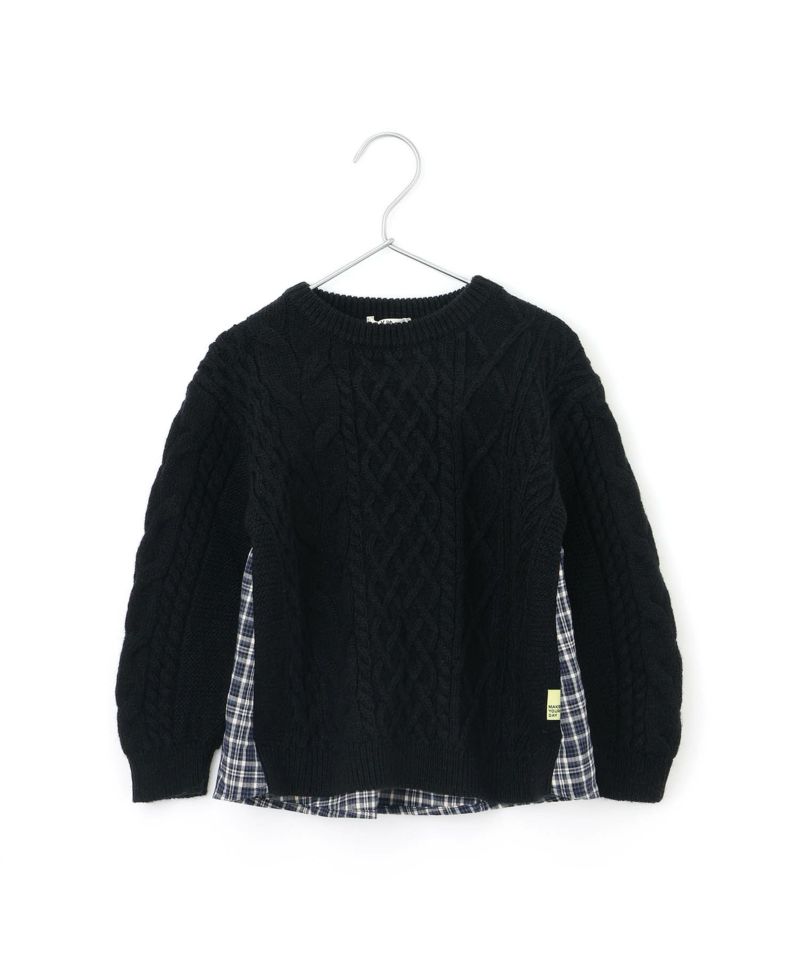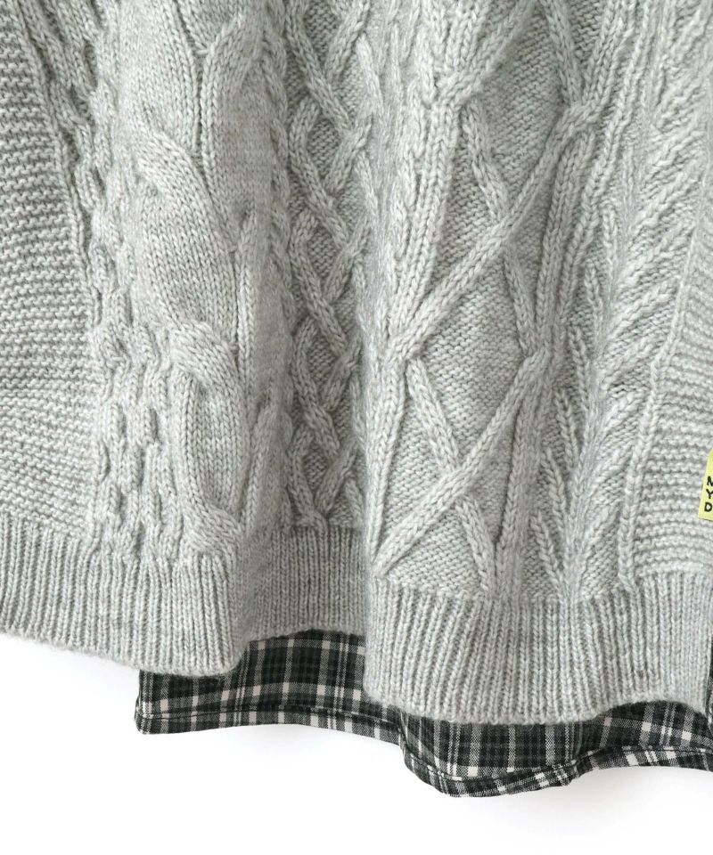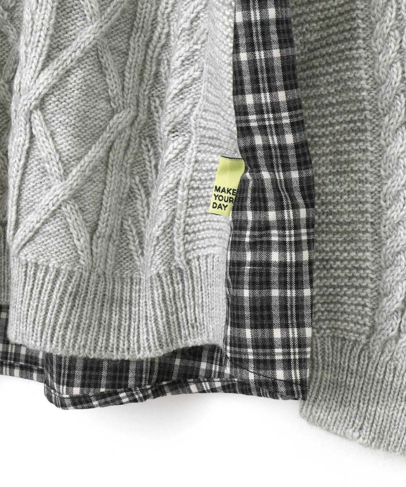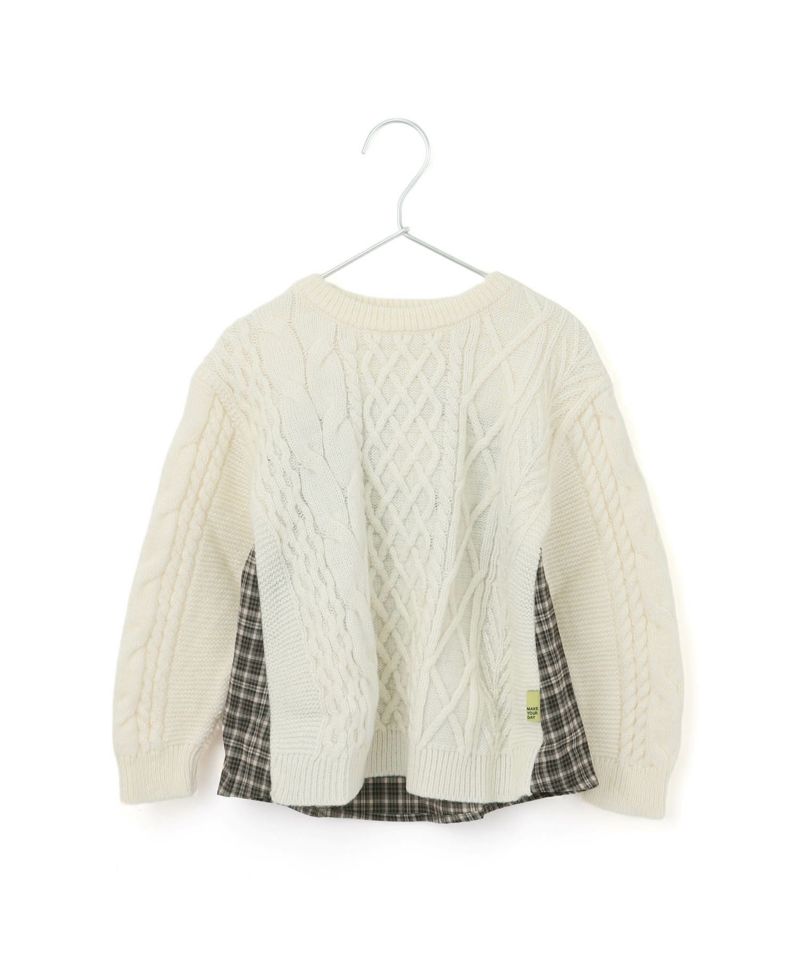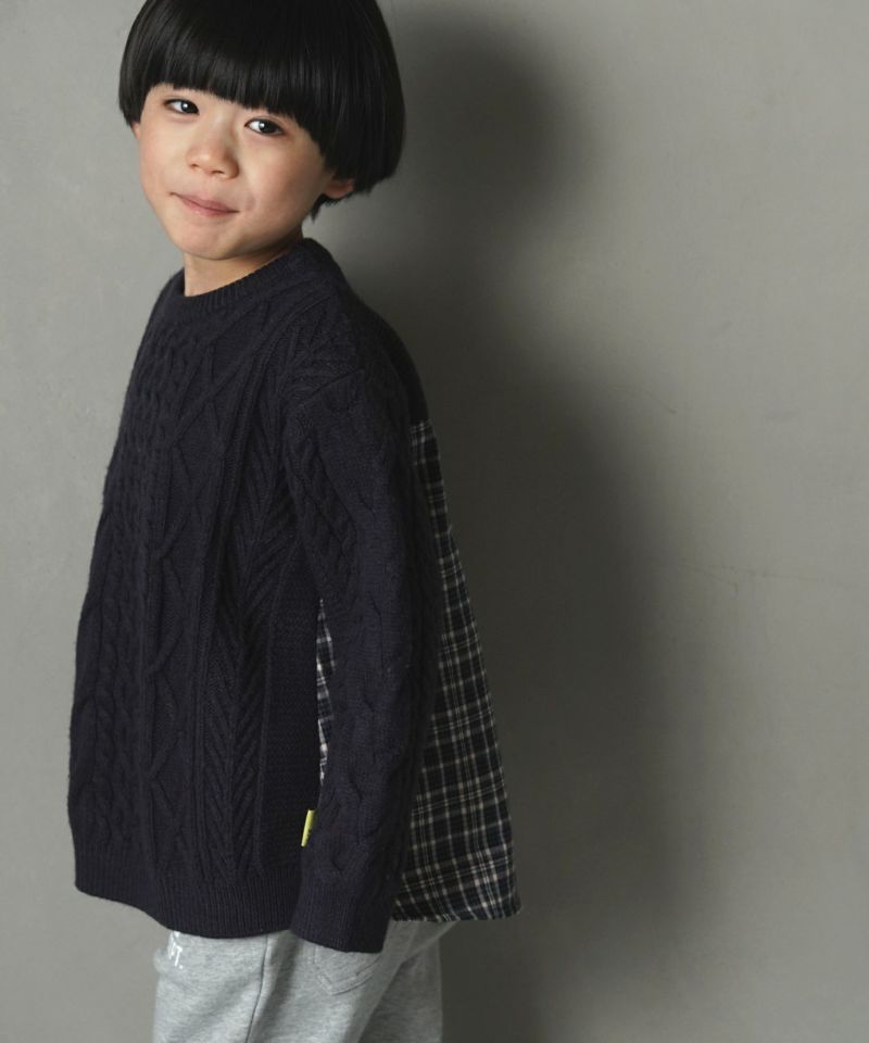 アラン模様のニットと、チェック生地が前後で切り替わっているプルオーバー。