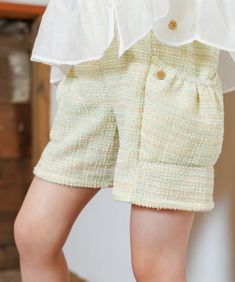 高級感のあるツイード素材と、シャーリング素材を使用したショートパンツ。