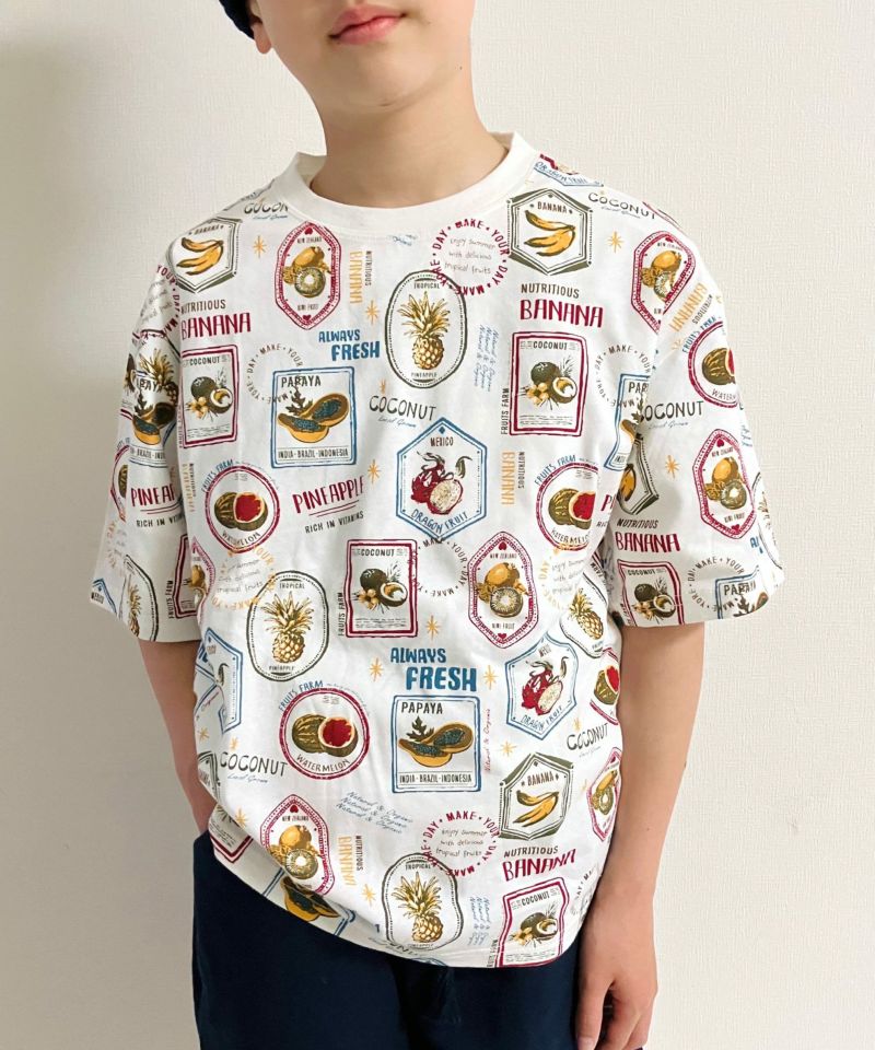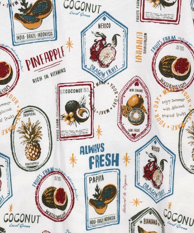 トロピカルなフルーツのステッカーをたくさん貼り付けたようなポップな総柄Tシャツ。