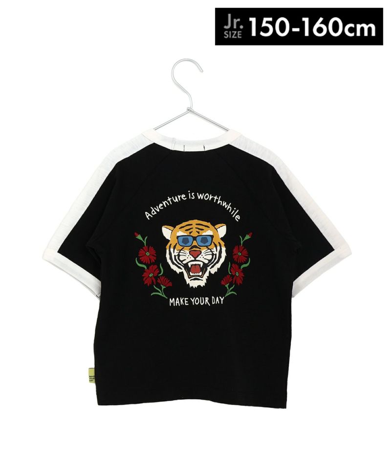 サングラスかけちゃう。お花も背負っちゃう。そんなファンキーなトラさんを背中に描いたスカジャン風Tシャツ。