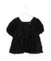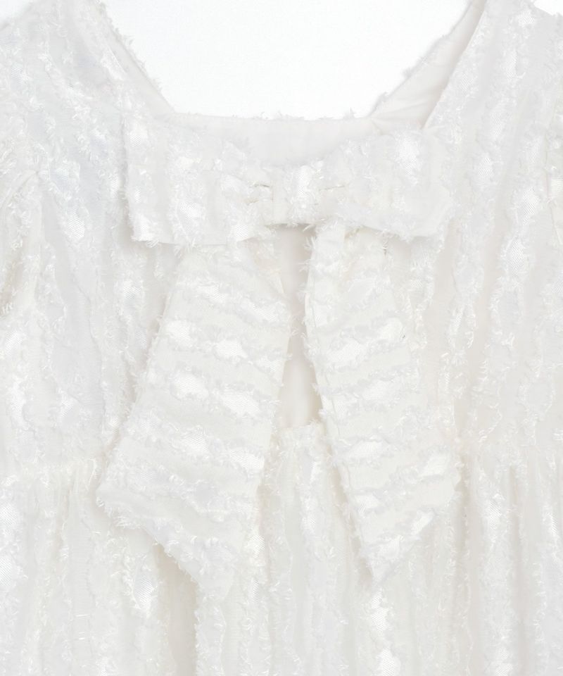 もけもけで光沢感のある素材、パフスリーブやペプラムのシルエット、インパクトのあるバックリボン、適度な肌見せ、どこをとっても抜けめのないかわいいデザイン。