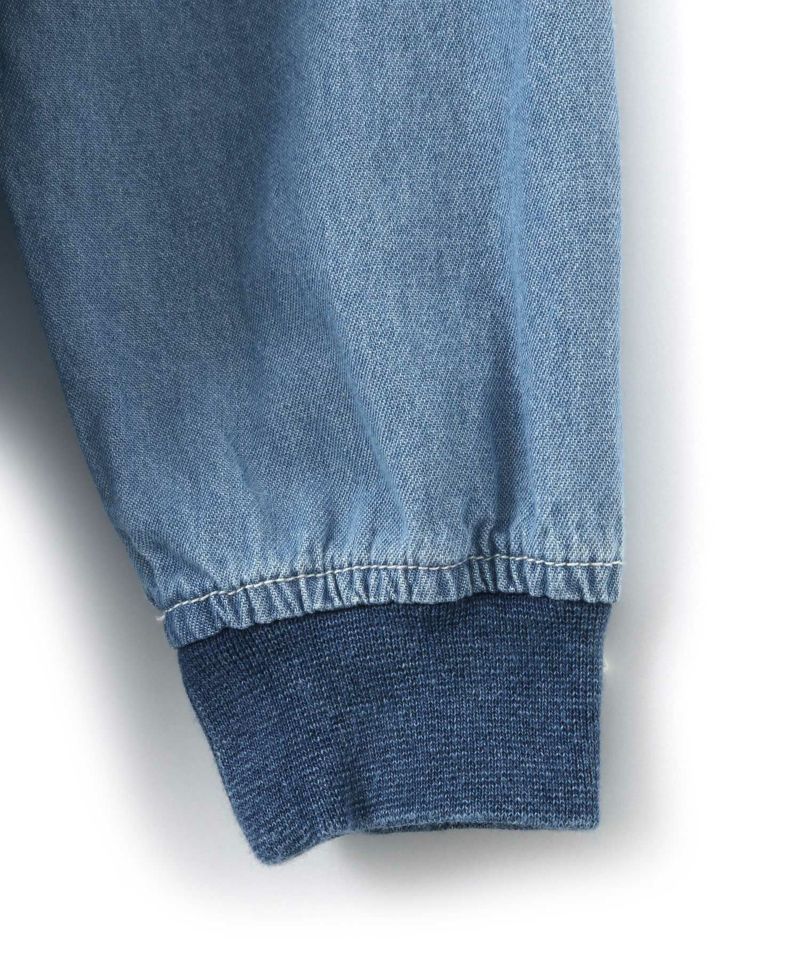 オフホワイトの方は少し厚手でストレッチが入った素材、ブルーの方はストレッチがなく薄手の素材です。