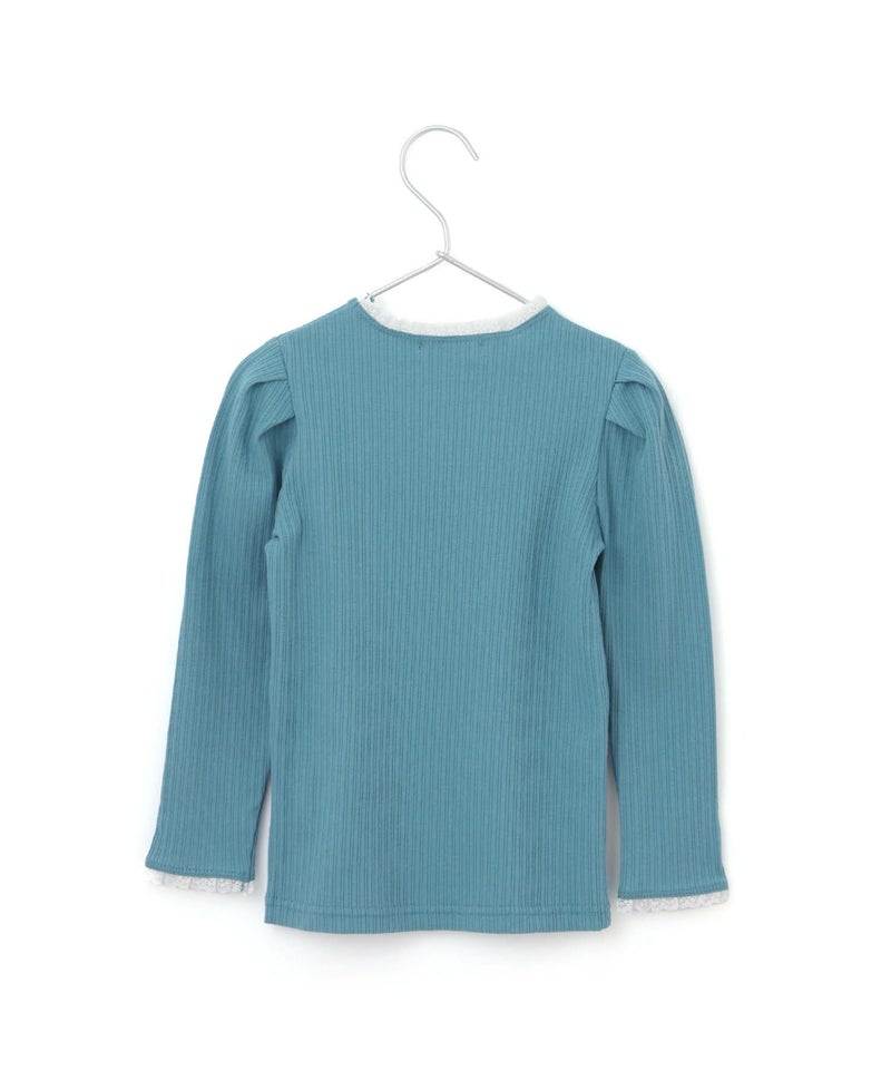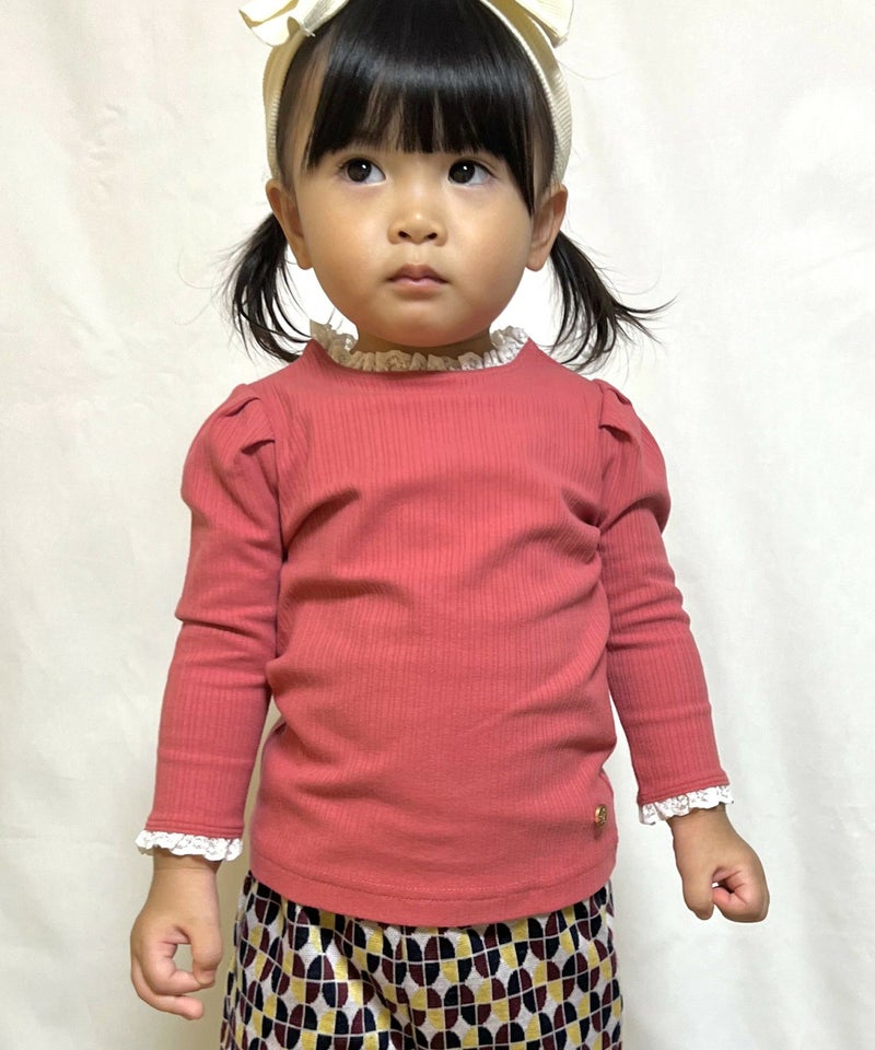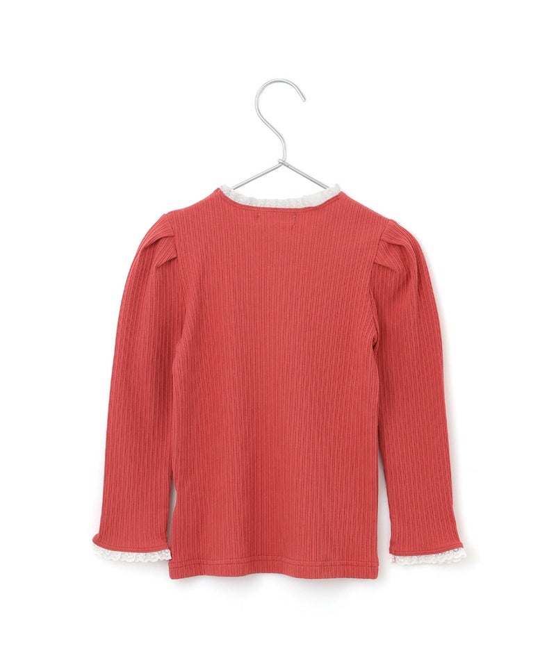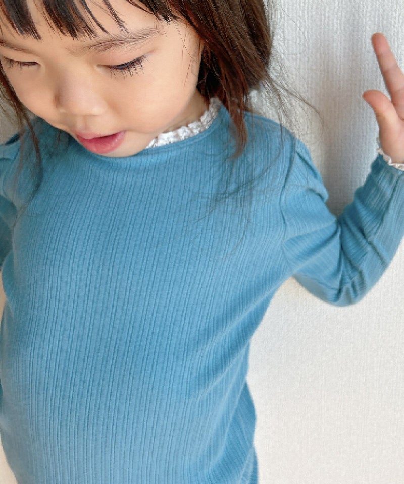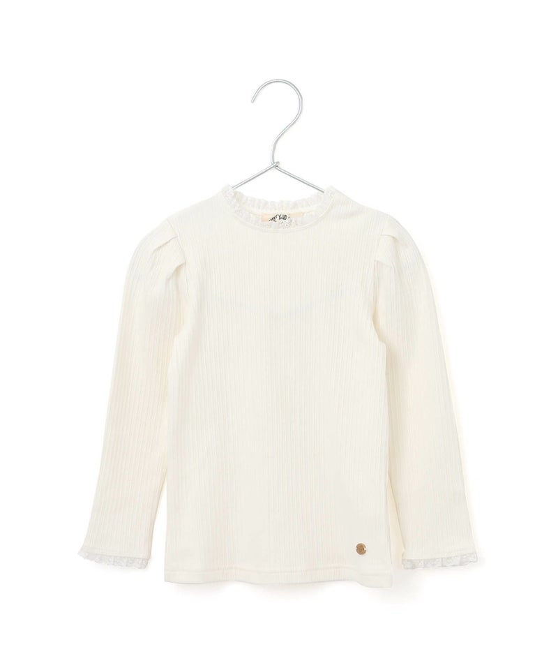 レイヤード風のフリルが首元と袖口をいろどるテレコリブの長袖Tシャツ。