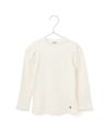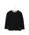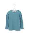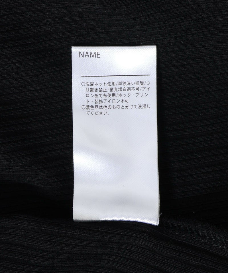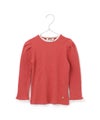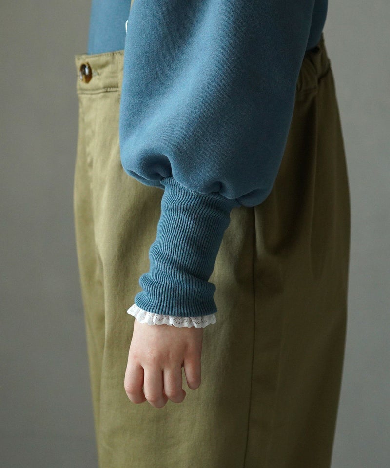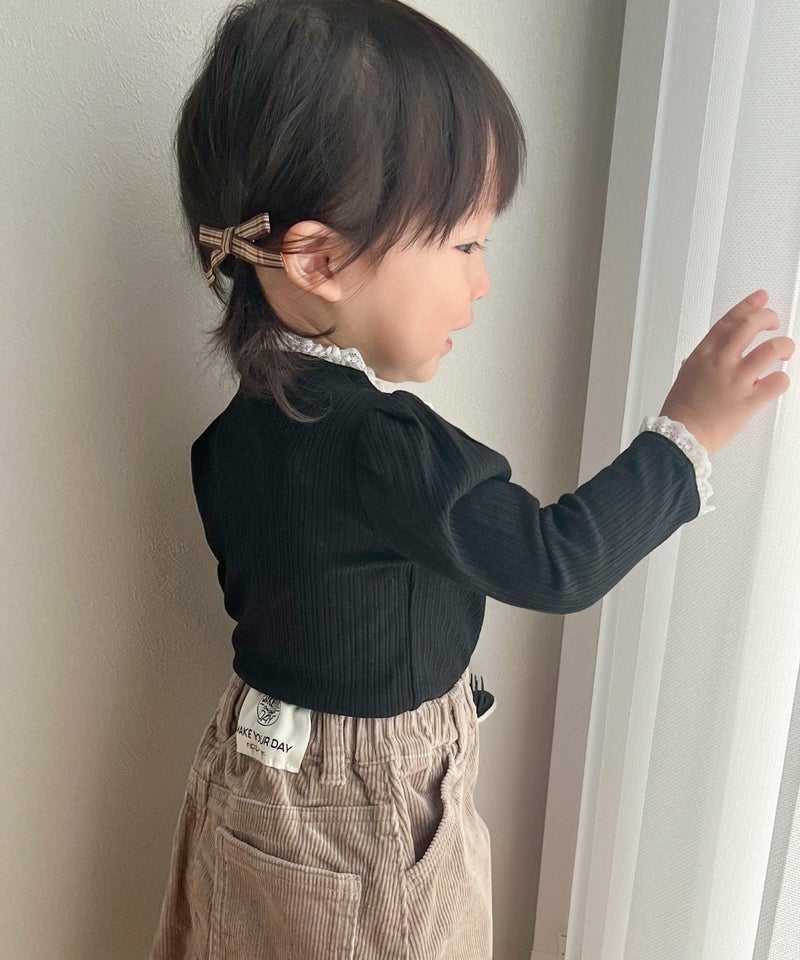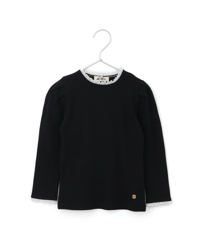 レイヤード風のフリルが首元と袖口をいろどるテレコリブの長袖Tシャツ。