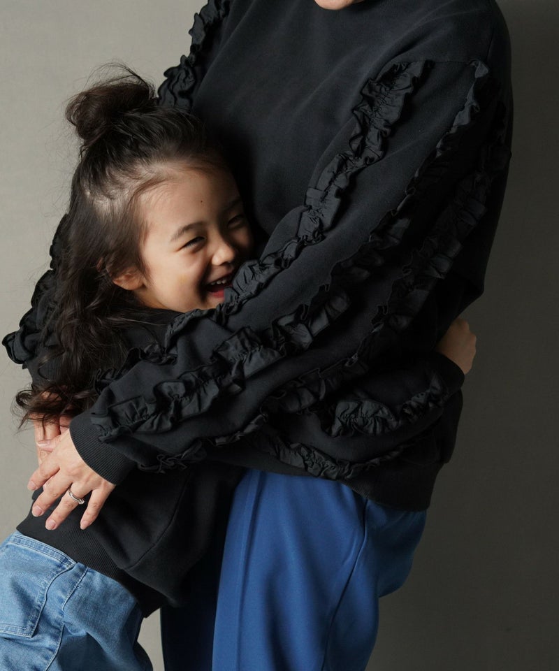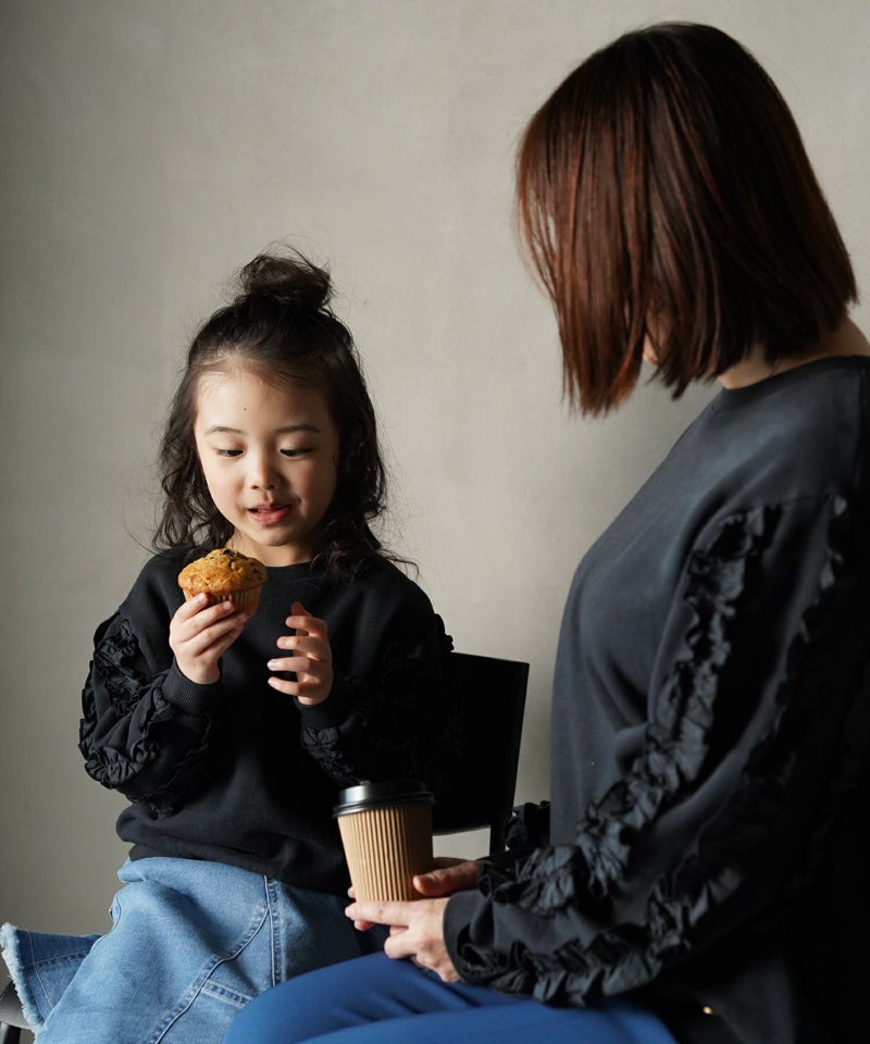 ベーシックな無地だからこそお袖のフリルが印象的。だけど同色のフリルだから主張しすぎずママも着やすいバランスです。