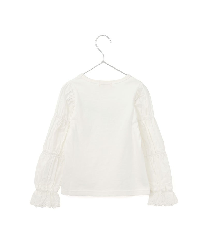 大人も着やすい無地の素材をベースに、女の子のかわいらしさを引き立てるお袖にデザインを入れたTシャツです。