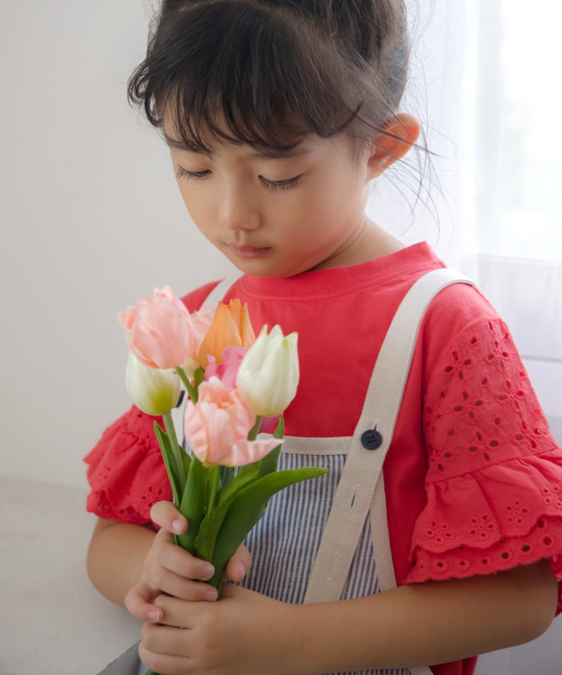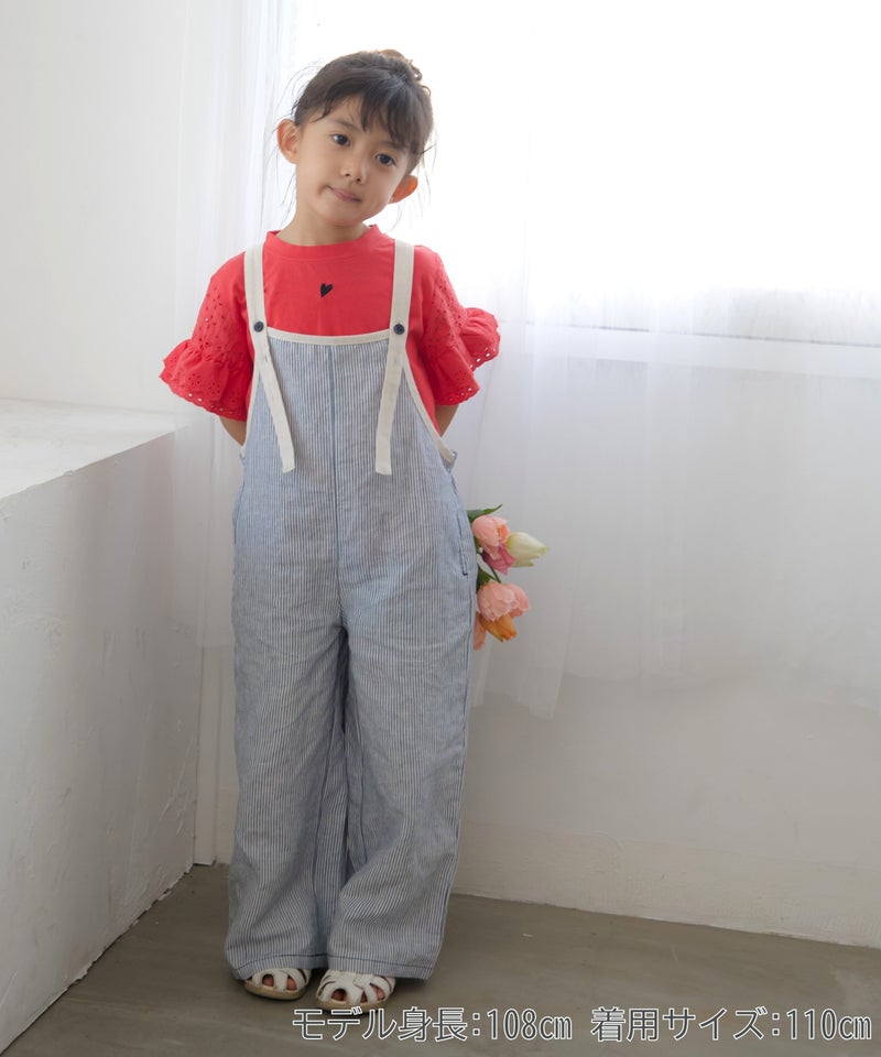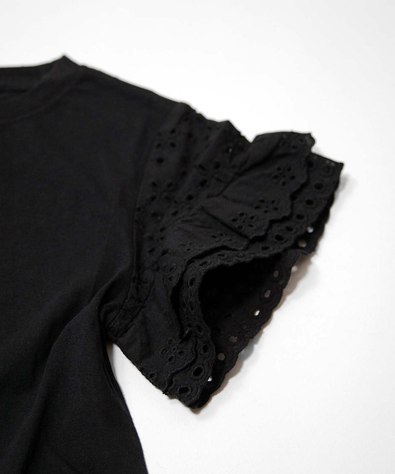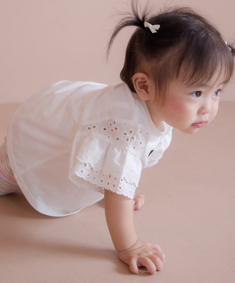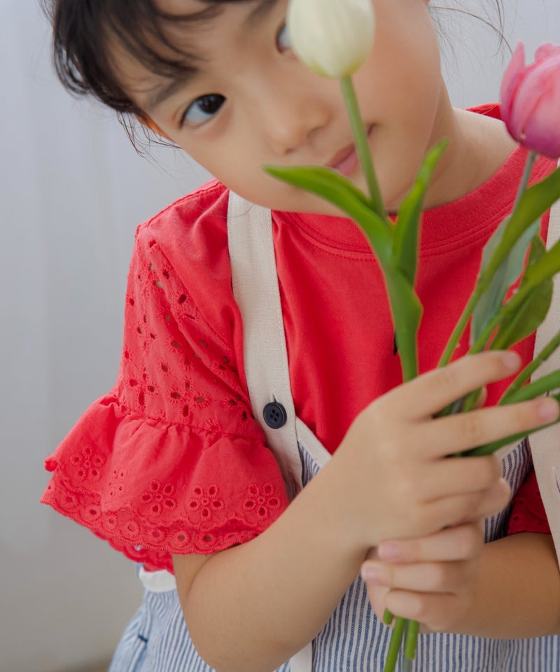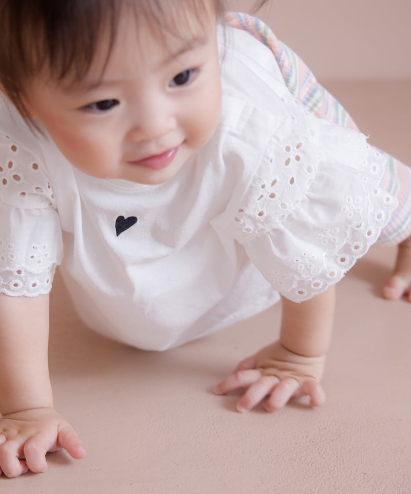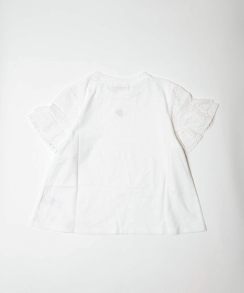 アイレットレースのボリュームのある袖や、きらっと光るコインタグ、胸元のハートの刺繍など、女の子の好きを集めたシンプルなTシャツ。