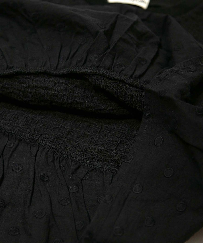 シャーリングの素材と、ドットが刺繍された同色の素材が組み合わされた女の子向けのTシャツ。