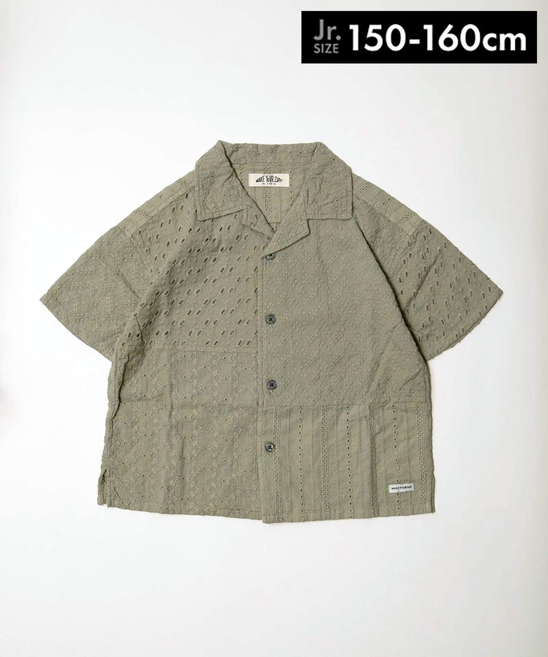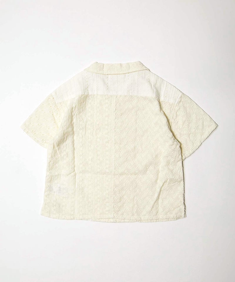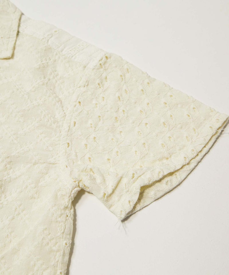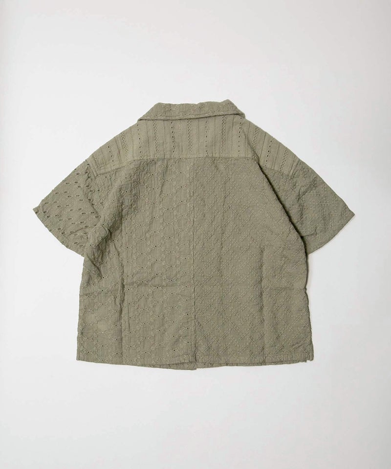 いろいろな種類のレース生地をパッチワークにした半袖シャツ。