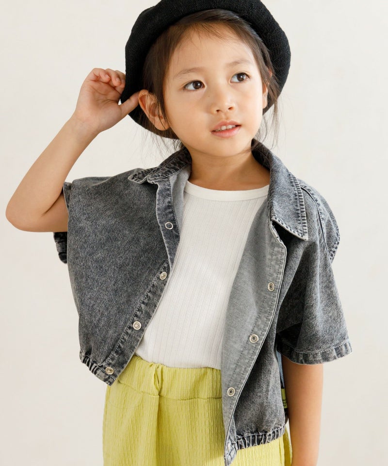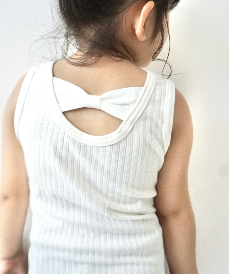 後ろに大き目のかわいいリボンがついていて、1枚でアクティブに着ていただいたり、大人みたいにシャツの中にインナーとしても着ていただけます◎