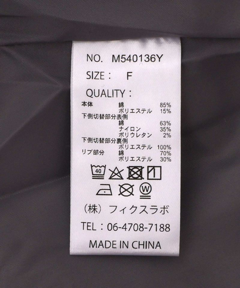 本体)綿85% ポリエステル15% 下側切替部分表側)綿63% ナイロン35% ポリエステル2% 下側切替部分裏側)ポリエステル100% リブ部分)綿96% ポリウレタン4%