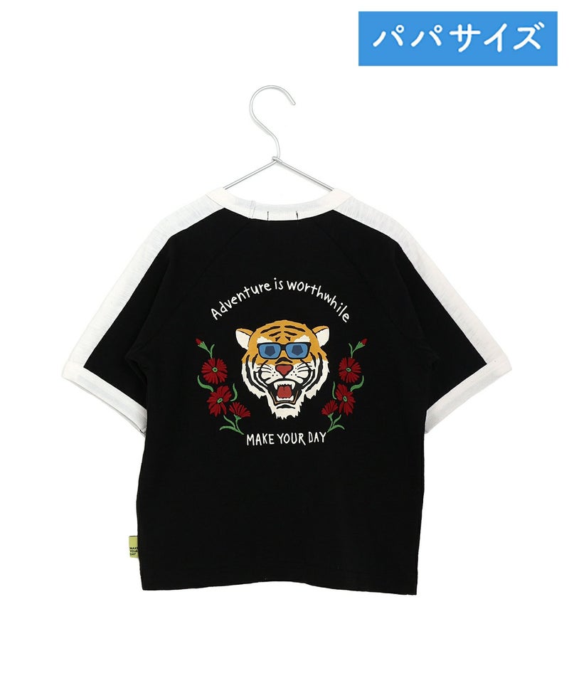 サングラスかけちゃう。お花も背負っちゃう。そんなファンキーなトラさんを背中に描いたスカジャン風Tシャツ。