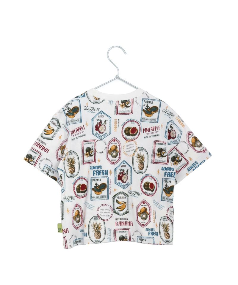 トロピカルなフルーツのステッカーをたくさん貼り付けたようなポップな総柄Tシャツ。