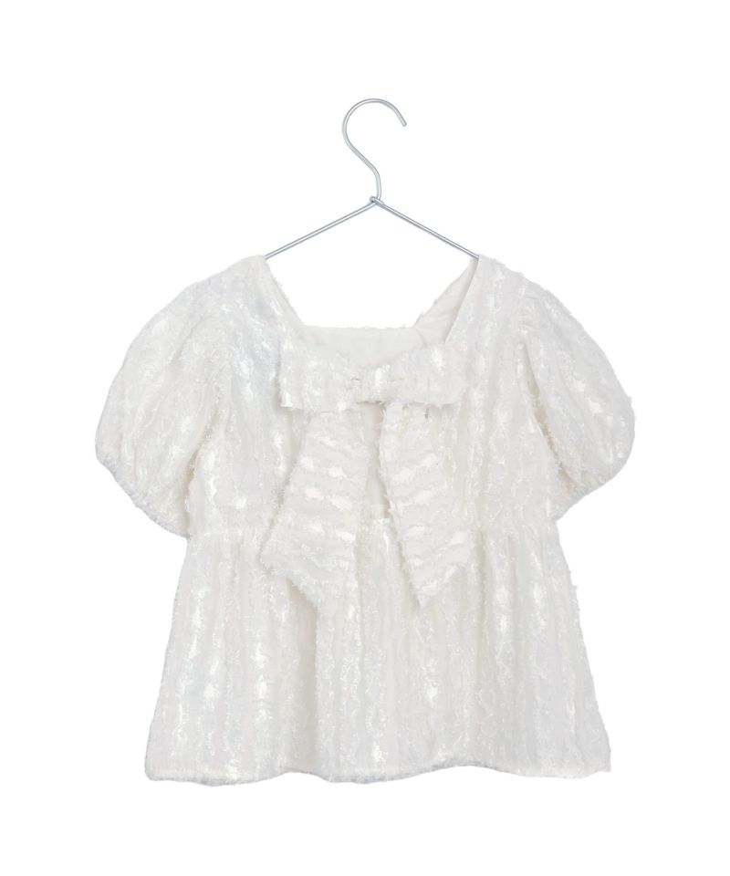 もけもけで光沢感のある素材、パフスリーブやペプラムのシルエット、インパクトのあるバックリボン、適度な肌見せ、どこをとっても抜けめのないかわいいデザイン。