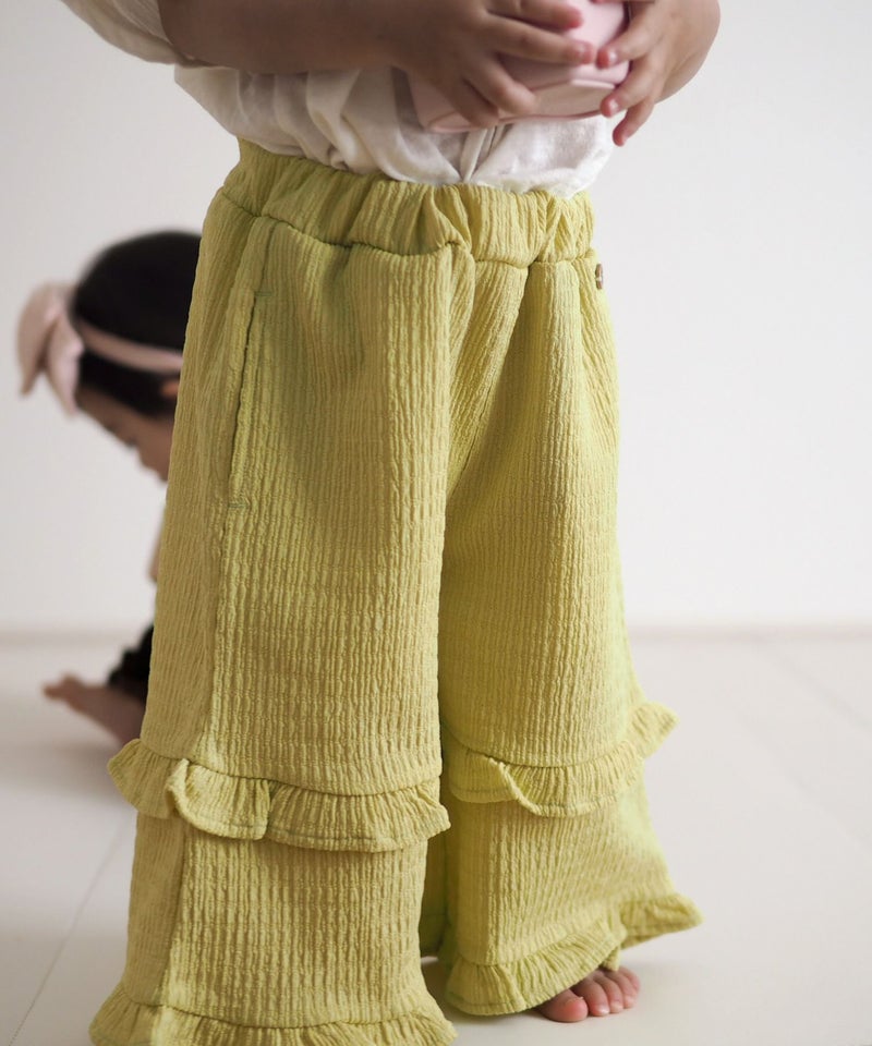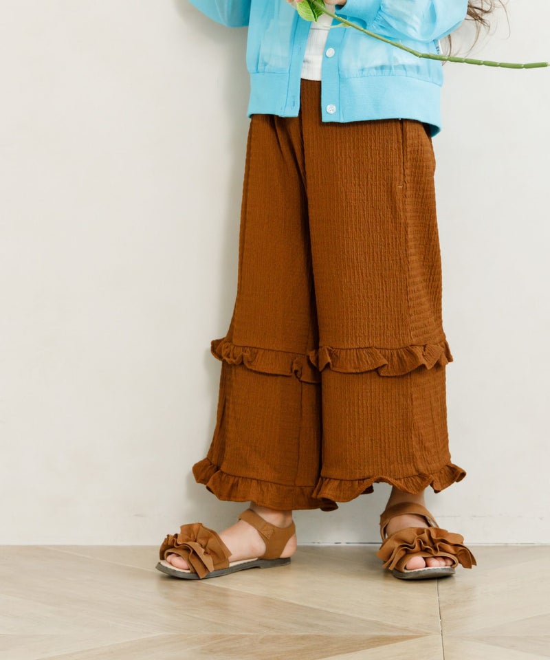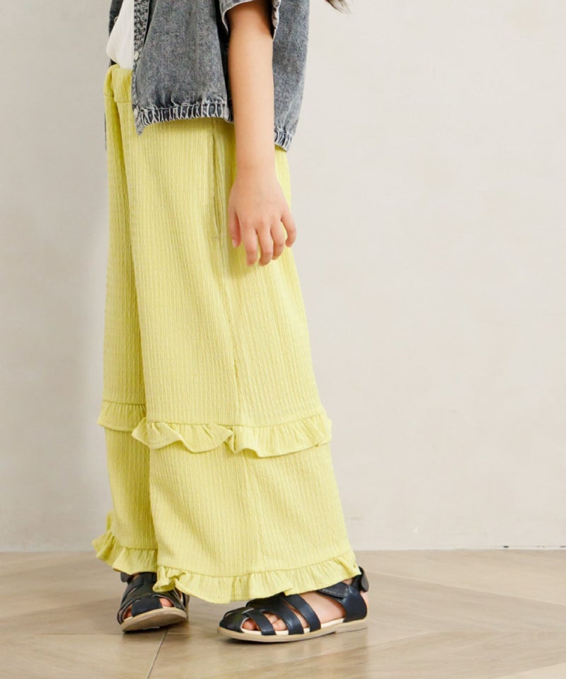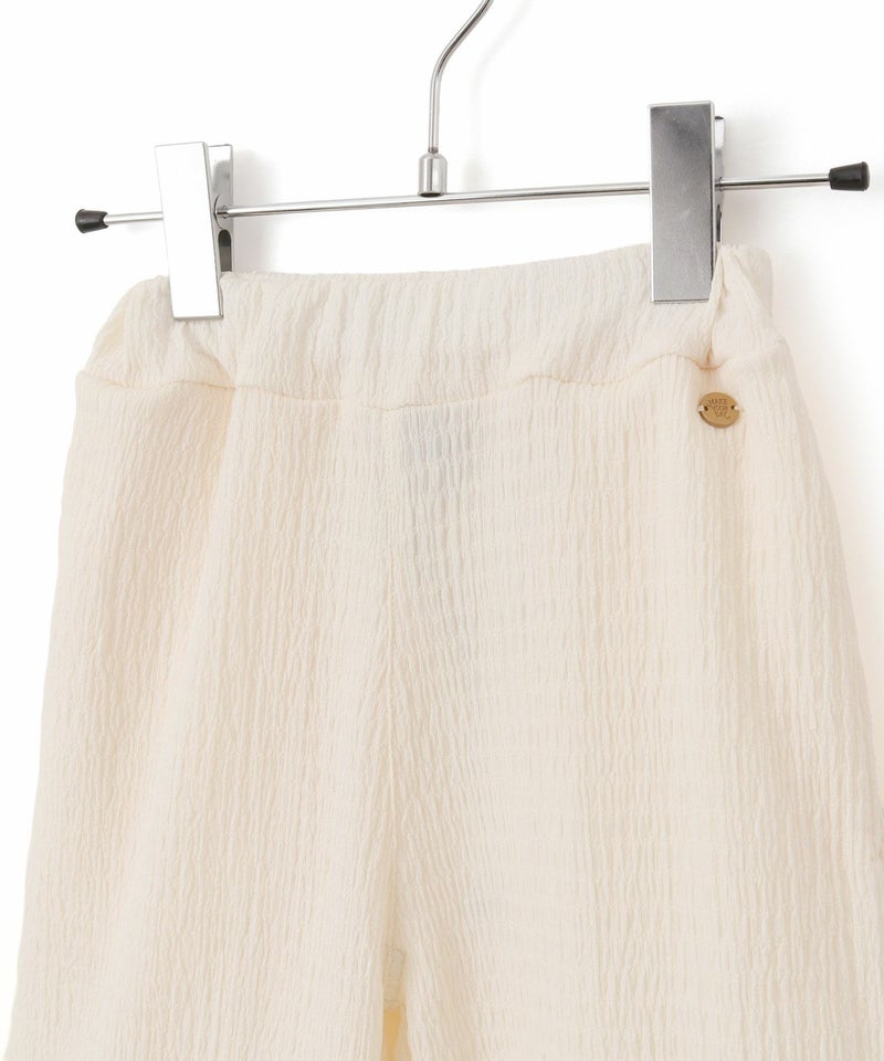 トレンドのぽこぽこした素材のパンツでスタイルアップを叶えてくれるバツグンのシルエット!