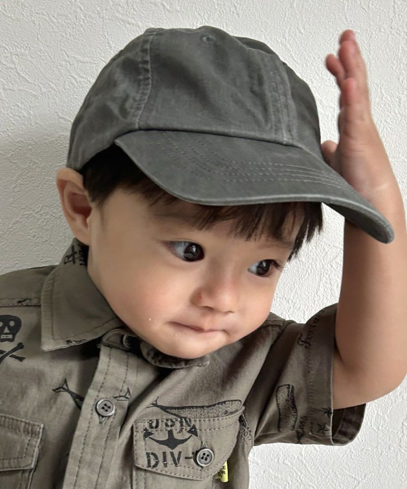 インパクト強めの総柄とシンプルなロゴのキャップ。