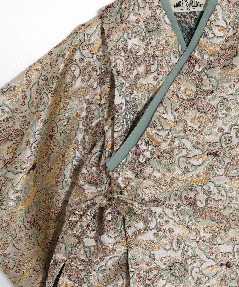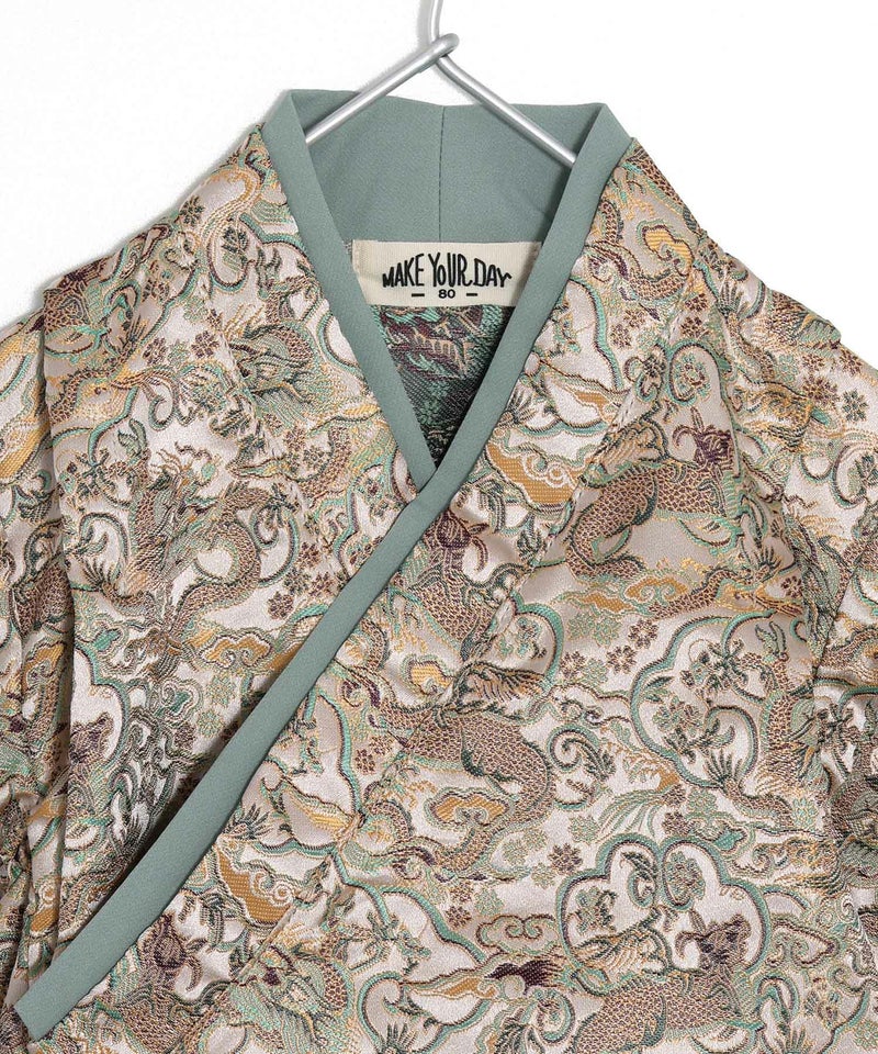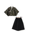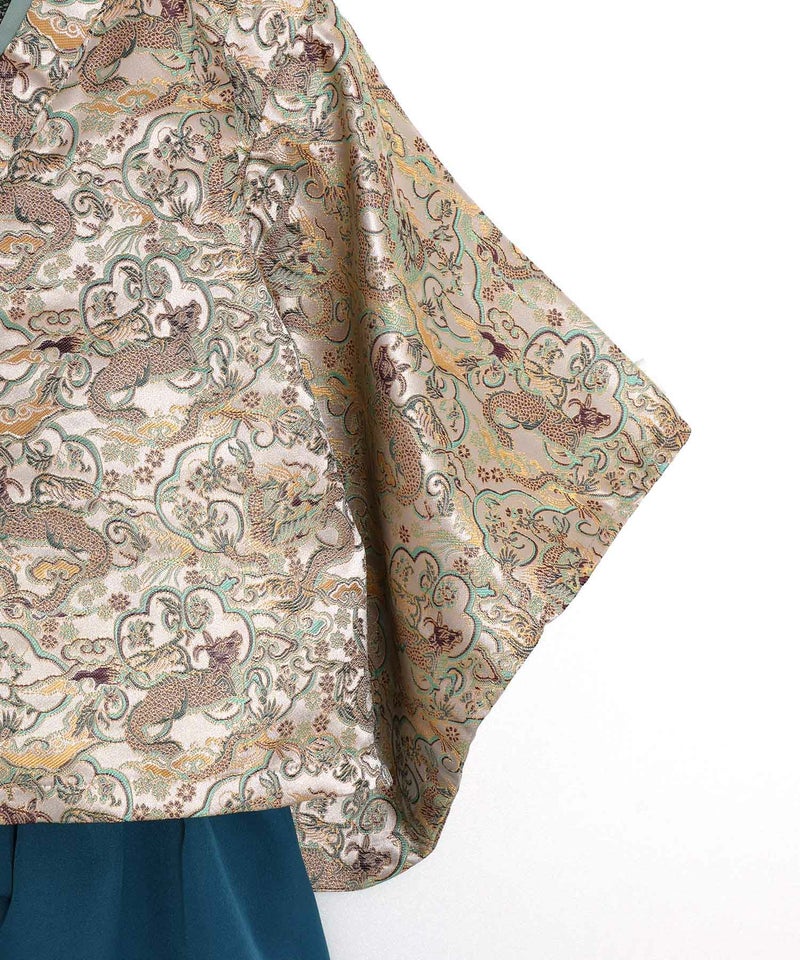 落ち着いた大人っぽい和柄の羽織と、十文字の前紐がかっこよく、まるで大人の袴を着せているようなデザイン。