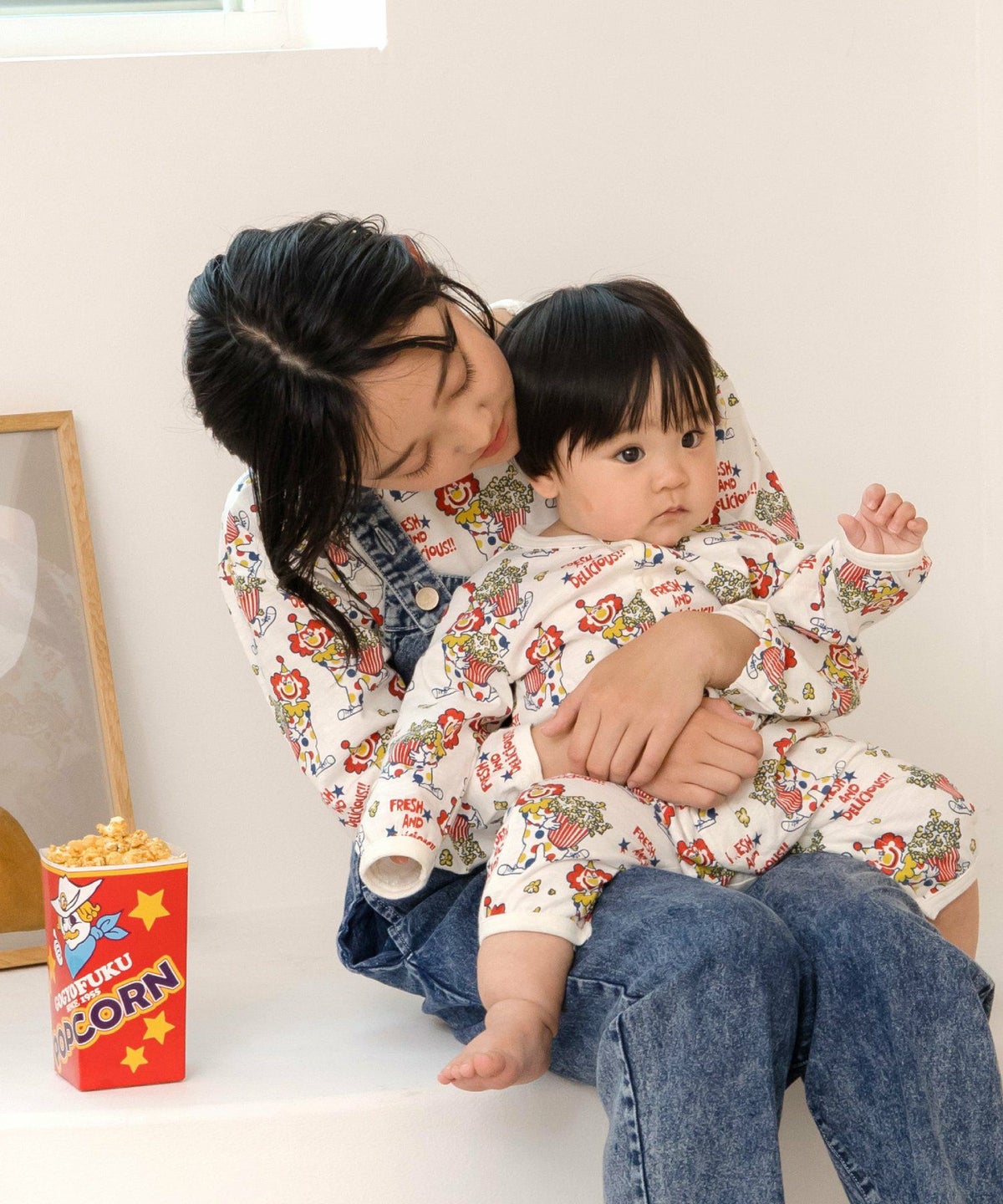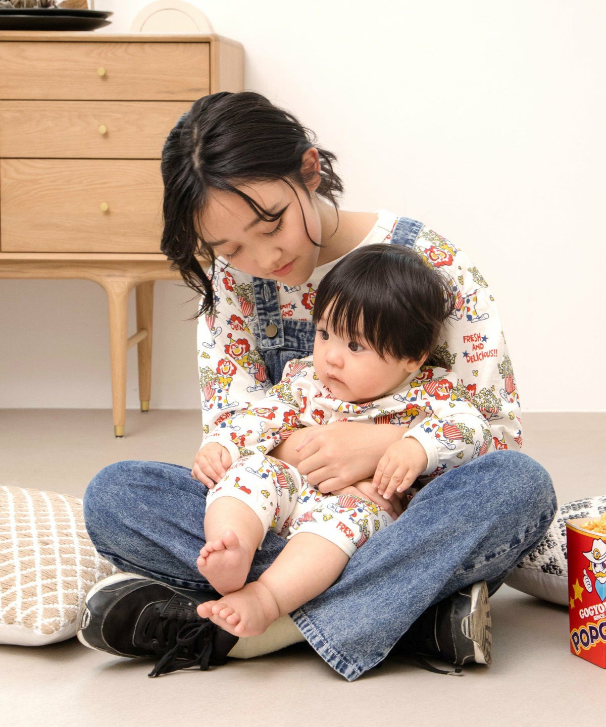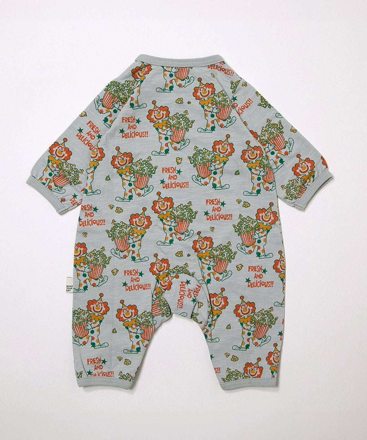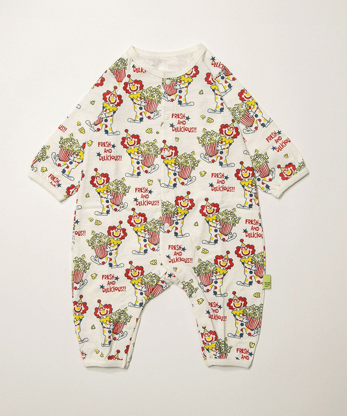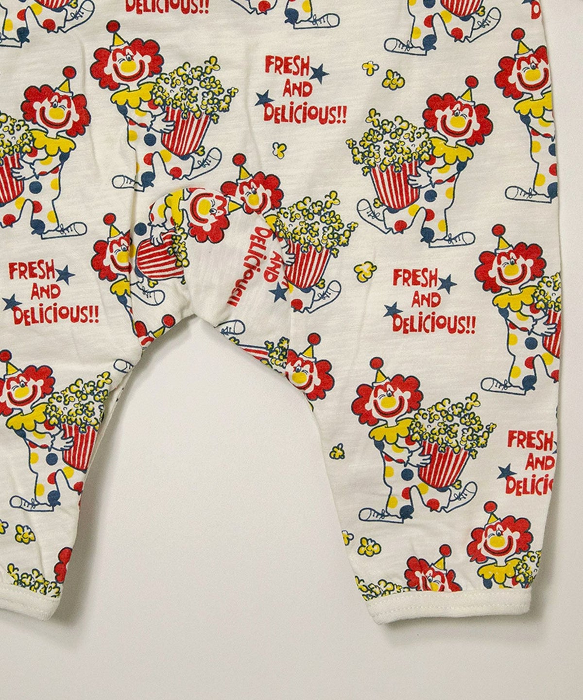 ピエロとポップコーン総柄前開きカバーオール